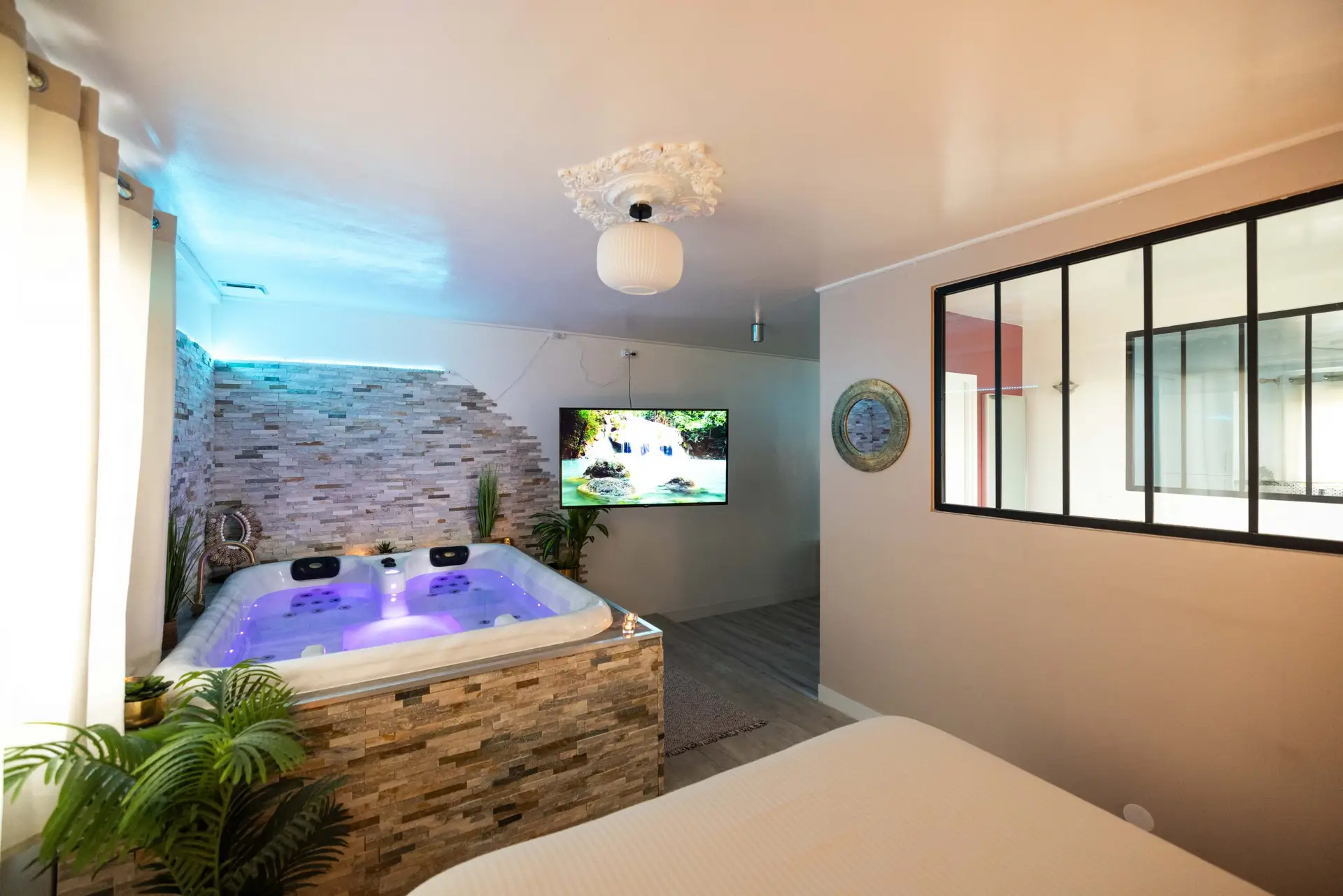 Du jacuzzi il vous sera possible d’observer la télévision à écran plat 4K orientable 50 pouces avec Smart TV (Netflix, YouTube, etc.)
